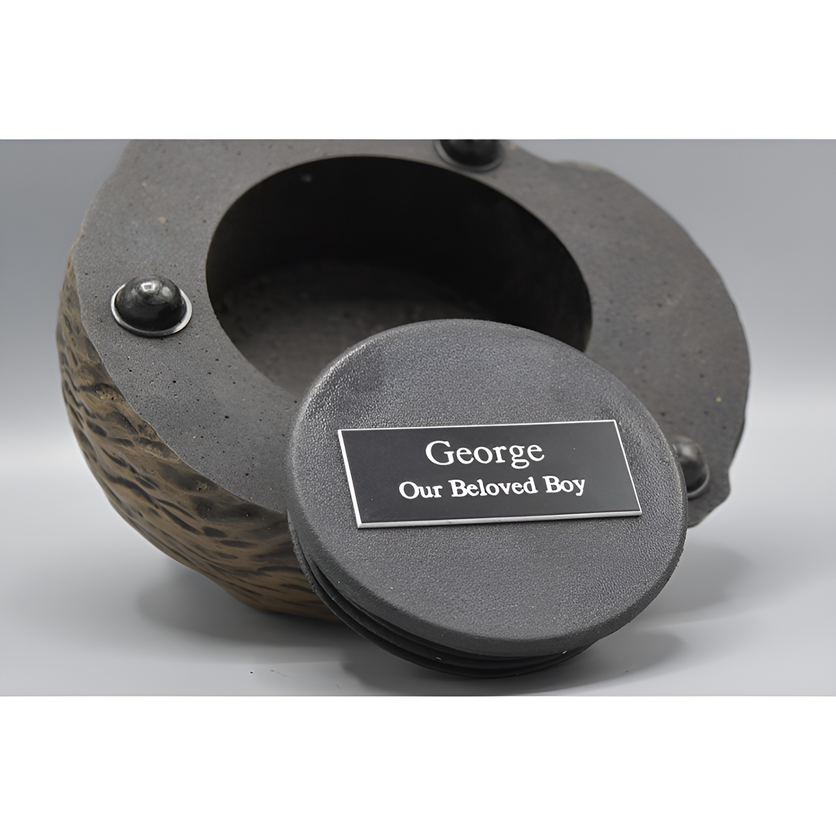 It can be personalized with a name plate fixed to the base of the cat urn, the plate is suitable for a name and life dates (eg Dec 2012 – April 2018).